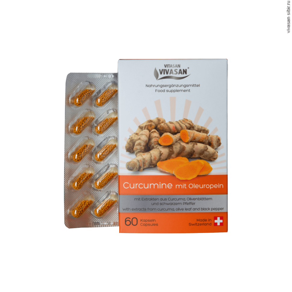 Состав: экстракт куркумы (куркумин) 7,5%, экстракт листа оливы (олеуропеин) 3%, экстракт черного перца (пиперин) 0,3%. Упаковка: 60 капсул.